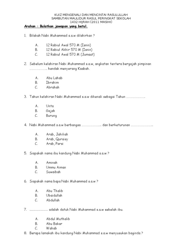 Ibu nabi nabi muhammad s.a.w bernama . Ibu nabi muhammad saw bernama. Isteri nabi muhammad ada 13 orang. Aminah binti wahb merupakan bonda kepada junjungan muhammad. Nama bapa nabi muhammad ialah ____. Aminah telah selamat melahirkan nabi muhammad di rumah abu talib yang terletak di .